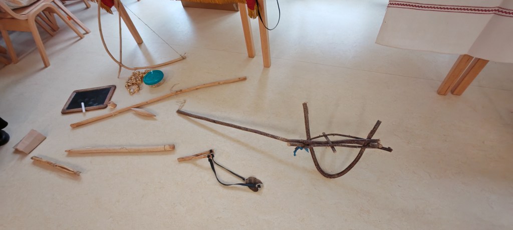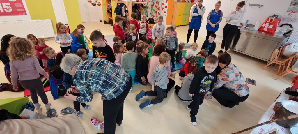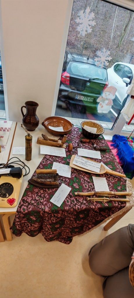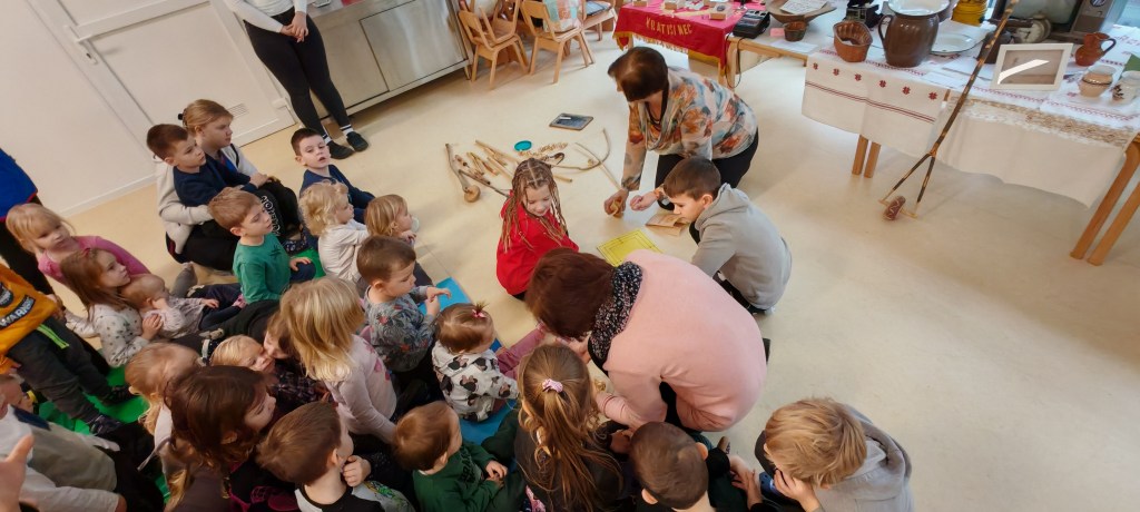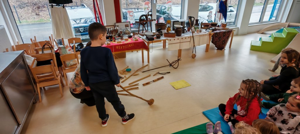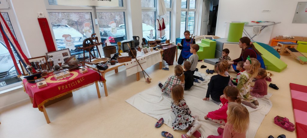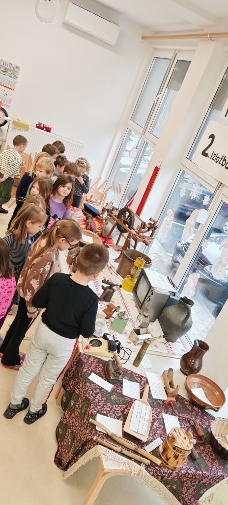 Cijelu izložbu i manifestaciju zaokružili smo druženjem s članicama Društva žena iz Gornjeg Kraljevca koje su nas posjetile u utorak, 03.02. Svojim bogatim iskustvom i znanjem predstavile su djeci razne igračke iz starijih vremena. Bila su tu igrala za bincekovanje, mlinčekovanje, goslice od kukuruzovine, praćke, sanjke od pruća, luk i strijela, puškolec,…Djeca su s velikim zanimanjem slušala kako su te igračke nastale, tko ih je izrađivao, čemu su služile, te na kraju i svaku od njih i isprobala. Na kraju su naše gošće podijelile djeci prstenje od slame koje su same izradile.